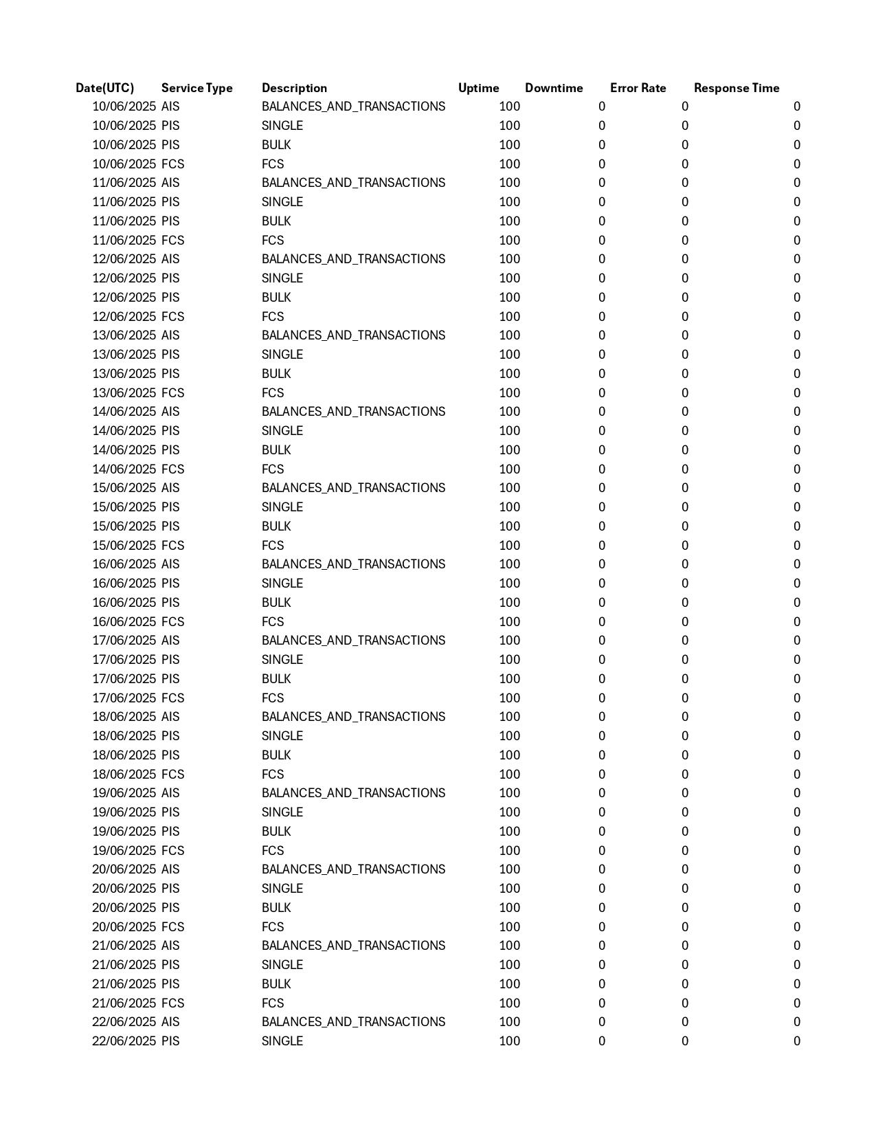 Keywords metrics statistics performance availability uptime downtime response 1st quarterly metrics (open banking APIs only) Dear partners,Please find below the very first quarterly metrics on NiCKEL open banking APIs since the go-live on June 10th 2025.Home banking metrics will be published later on, thanks for your understanding!